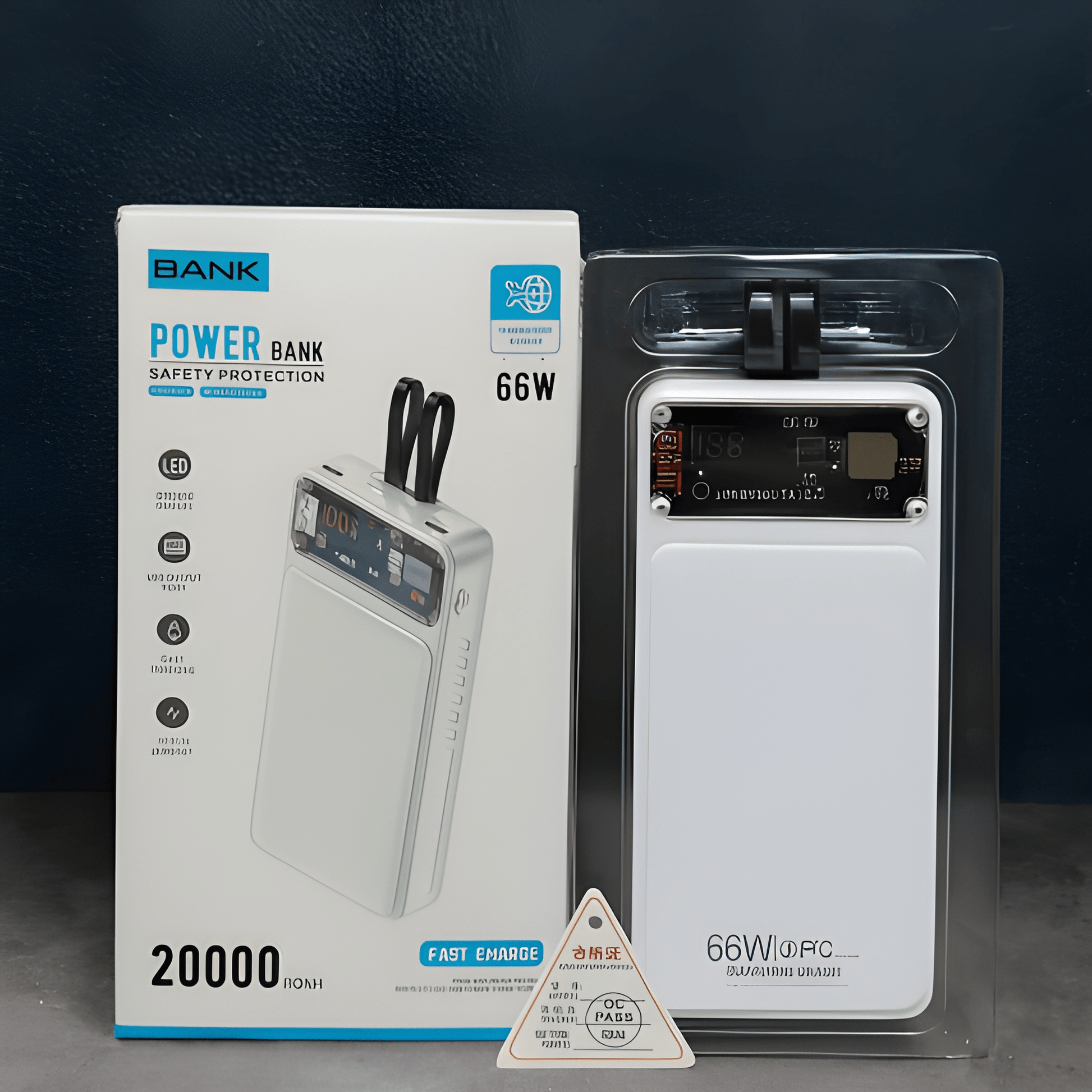 Experience Unmatched Charging Speed And Efficiency With The 66W 20000mAh Power Bank. Designed For Power Users, This Super Fast Charging Power Bank Features Dual USB Output Ports, Allowing You To Charge Multiple Devices Simultaneously. The Built-In LED Screen Display Shows Real-Time Battery Status, Ensuring You’re Always Aware Of Power Levels. Crafted With Safety Protection Technology, It Guards Against Overcharging, Overheating, And Short Circuits, Making It Safe And Reliable For Everyday Use. Perfect For Travel, Work, Or Emergencies, This Compact Power Bank Combines Style, Performance, And Durability To Keep Your Devices Powered Anytime, Anywhere.